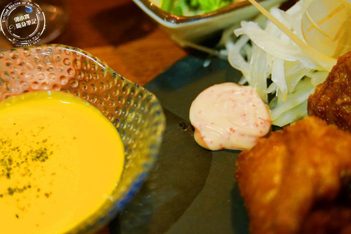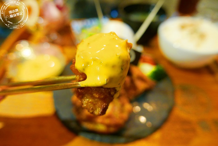 | 炸雞的部分加調過美乃滋的明太子跟起司的味道都超好的,只是因為明太子的量有點少,所以艾編都是沾起司醬吃,滑順濃郁的口感加上炸雞的酥脆,香氣太逼人啦,裡頭的雞大腿肉非常的鮮嫩多汁,肉質有彈性又新鮮,超級好吃的,真心推薦這搪揚雞好銷魂好好吃,吃過會回味的難忘好滋味呀! |