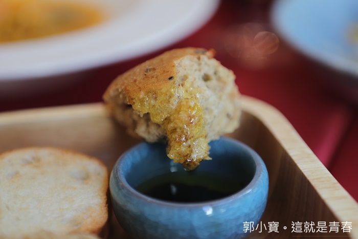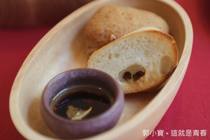 | 麵包有核果麵包跟厚切喬巴達,這兩款麵包都是很多人喜歡的餐前麵包,搭配的是巴薩米可橄欖油,我個人現在越來越喜歡吃著軟嫩可口的麵包沾著橄欖油,那油香的滋味加上麵包的咬勁真的非常享受。 |