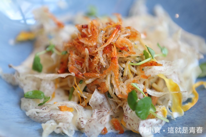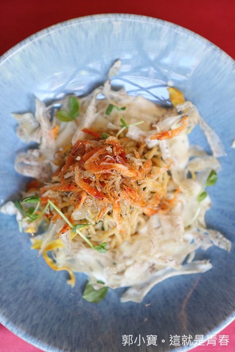 | 滿滿的櫻花蝦真的非常豪邁,師傅應該又沒算好成本了,搭配的奶油白醬,看起來就很可口,這一款單品我也是第一次看到,感覺滿具有挑戰性的,櫻花蝦的甜味跟甜菜所創造出來的風味讓我還滿期待的。 |