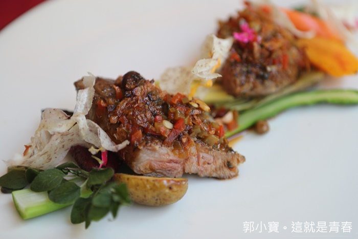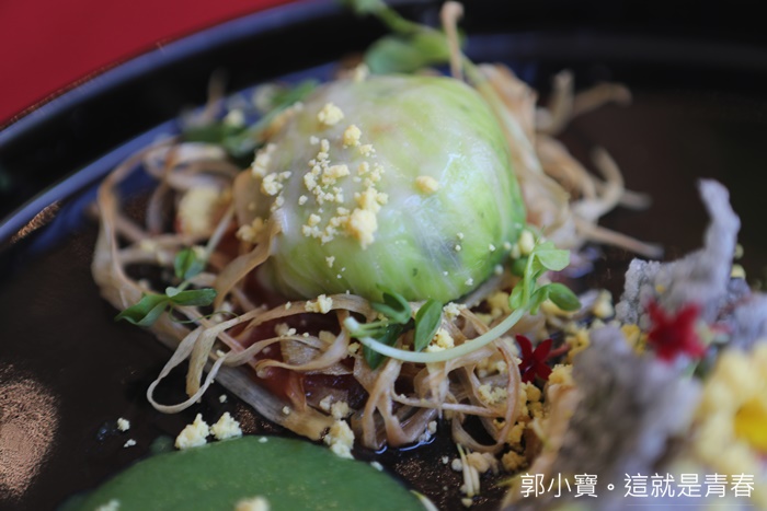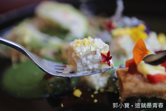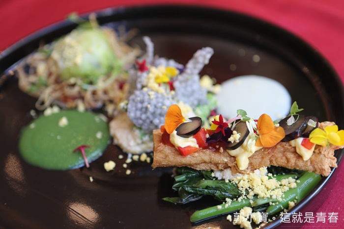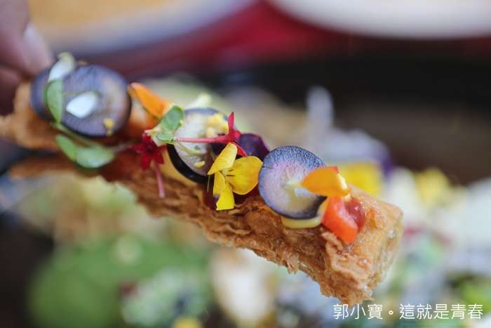 | 這豆皮脆餅也太美了,有一點讓人捨不得一口咬下他的美,除了鮮豔的蔬果以外,還搭配了法式荷蘭醬汁跟南投絲瓜雙醬汁,豆皮一口咬下脆度十足,非常新鮮美味以外,後面絲瓜的甜味跑得很足,在口中咀嚼的滿足度整整破表!! |