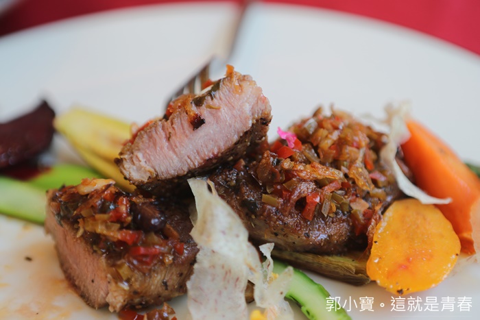 | 看看這超厚的豬肉切開時非常輕鬆,爐烤的溫度拿捏也非常好,顏色非常漂亮以外,搭配主廚特調的美式風味醬真的非常順口,肉質本身吃起來就很嫩口多汁以外,美式風味醬有點像是莎莎的感覺帶點甜度,非常適合搭配盤克夏一起入口,旁邊還有新鮮的蔬菜搭配,這一套我真心非常喜歡。 |