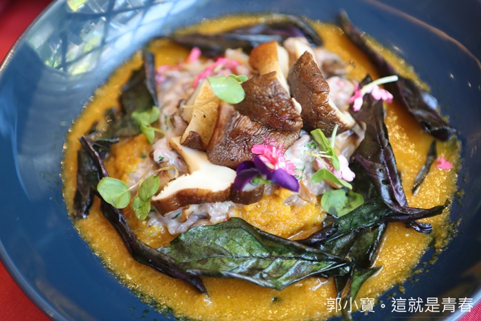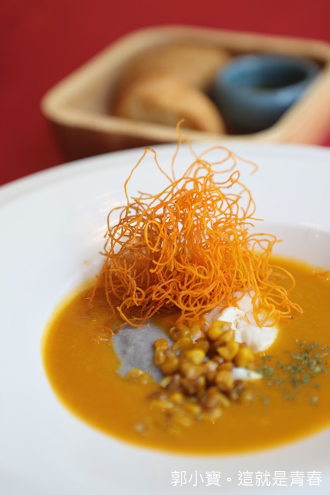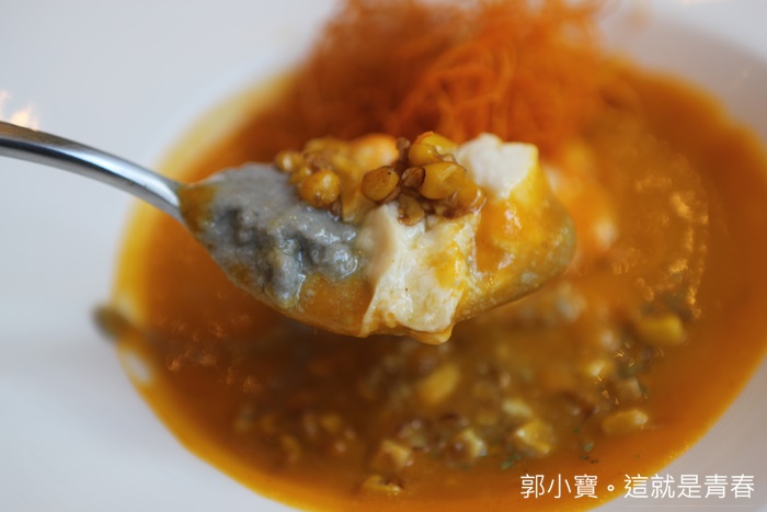| 喝下一口確實讓我驚訝了許久,這濃郁的南瓜湯還搭配了手工豆花跟芝麻,三種味道都非常濃郁以外層次也非常豐富,玉米是焦化玉米,增加湯品的口感豐富度,真的非常厲害的湯品,好喝!!! |