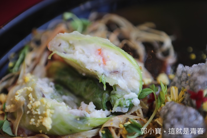 | 高麗彩蔬球也一整個非常特別,底下鋪著牛蒡絲以外,切開後那呈現出完美的乳白內餡讓人食慾大開,一口咬下那鮮甜嫩口的高麗菜還有軟稠的內餡非常美味。 |