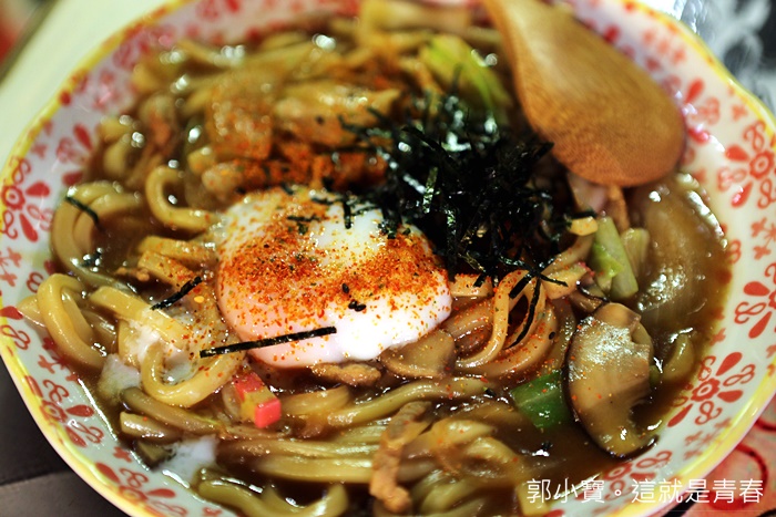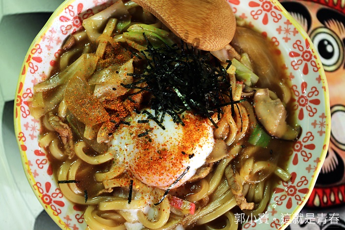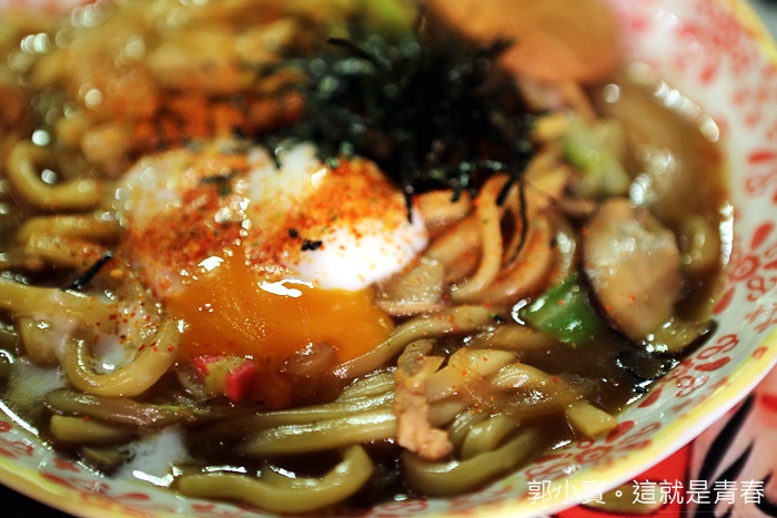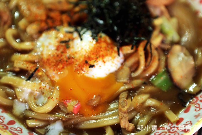 | 麵條是使用烏龍麵大品牌讚岐烏龍麵,其實吃來吃去除了日本的自家製麵以外,品質最穩定口感最好的我還是覺得讚岐最佳,大火翻炒下的讚岐烏龍麵收汁收的還滿稠的,所以每根烏龍麵條上面都緊緊巴著醬汁,收的很完美的烏龍麵,每一條烏龍麵除了彈牙的口感以外還有香濃的蛋黃液,加上大量的蔬菜的甜味,超美味的烏龍麵!!! |