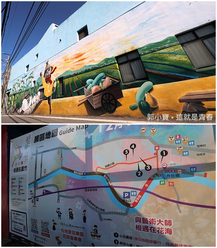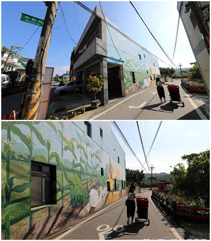 | 我們將車子停妥之後由外社街這邊進入,因為七個園區都還滿大的,每個園區的入口也很多個,外社街這條街道還特地將民宅側邊畫上大大的彩繪非常吸引眼球,當下就立馬決定從這邊進入蘆竹花彩園區。 |