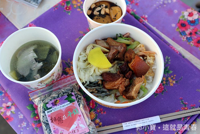 | 飯盒一整個超豐富的阿,裡面的控肉真的好好吃分量又多,還有湯品也超好喝,外加甜點是黑糖糯米麻糬好好吃,是傳統的客家甜點,這樣一份150真的超便宜的,還可以大家一起坐在花田下吃飯,真的超熱鬧的阿,難怪一個場次250個人瞬間被搶光,目前還持續加開場次中。 |