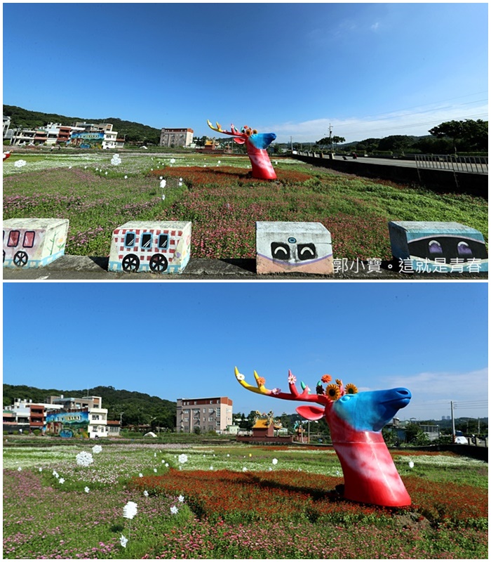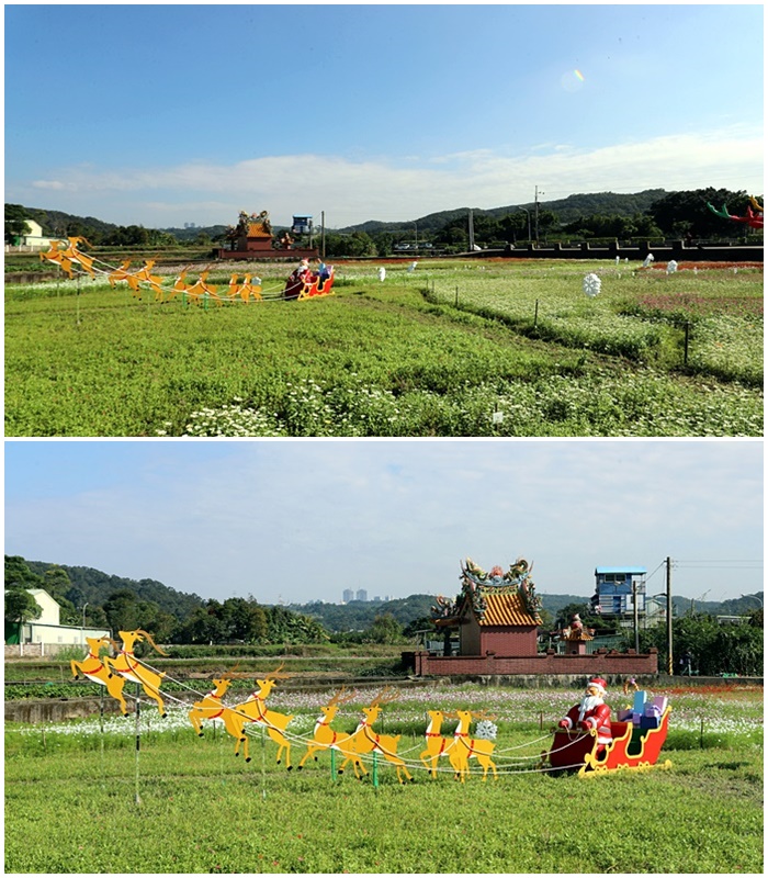 | 蘆竹花彩展區還有布置了聖誕節的主題布置物,超大的麋鹿造型藝術一整個顏色超繽紛的,就佇立在花海裡面非常顯眼,讓人忍不住跟他一起合拍幾張照片。 |