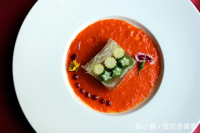 | 這原屬法式料理的蔬菜凍加上主廚的巧思,在視覺上也呈現了非常華麗的色彩,一端上來就很吸引人的目光,加上主廚特製的苦澄醬汁讓整體更美觀,運用了一些天然的花卉做盤飾,一看到就讓人食欲大開。 |