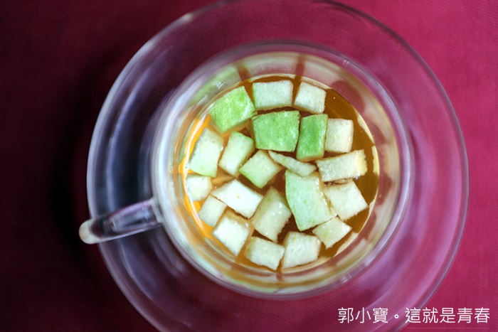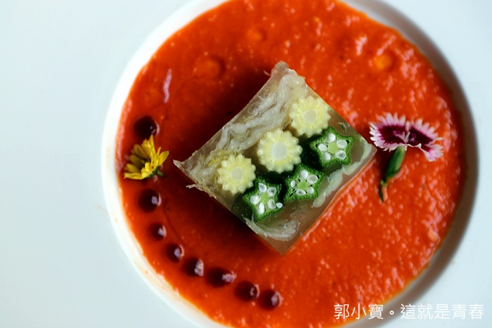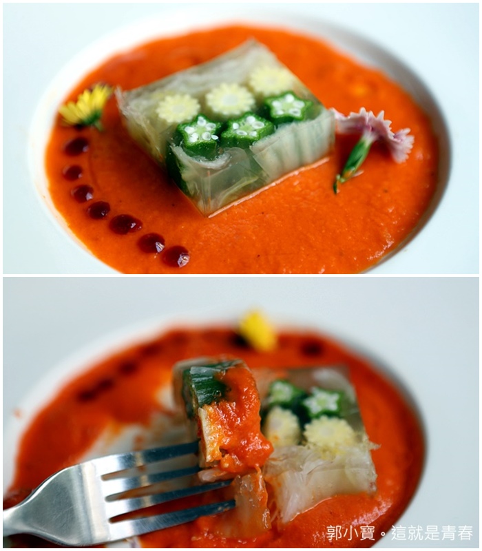 | 切下一小口蔬菜凍沾上醬汁入口,鮮甜的蔬菜及秋葵的滋味充滿嘴裡,醬汁基本上沒有太多的搶味,淡雅的滋味讓人真的一整個胃口大開! |