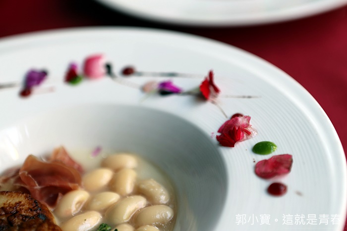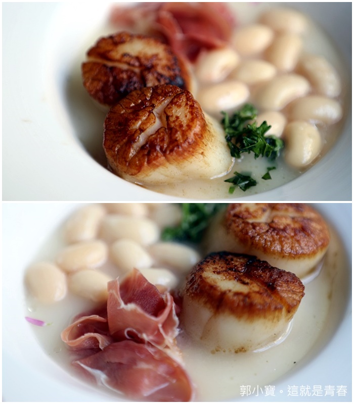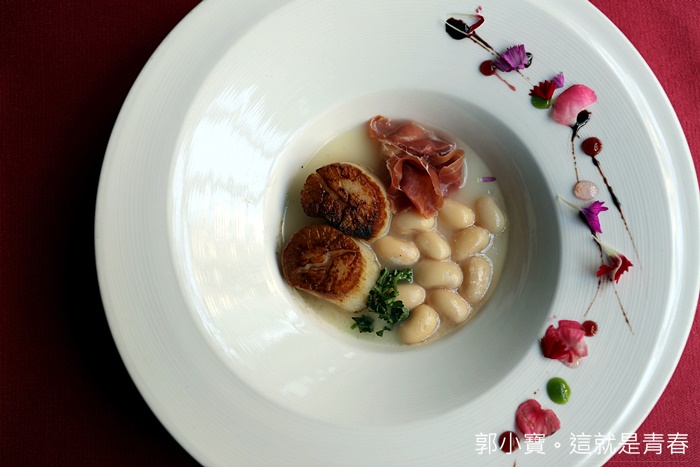 | 經過工作人員的提醒我才記起來他是一道湯品,因為我整個眼光都在大干貝跟火腿上,干貝先炙燒過色澤非常的美味以外,加上義式生火腿更顯得可口,搭配埃及豆的甜味,每一口都是非常極致的享受,大骨上白湯溫潤順口,整體的風味都拿捏得相當好,才第二道菜就有大干貝真的有點太爽了XD |