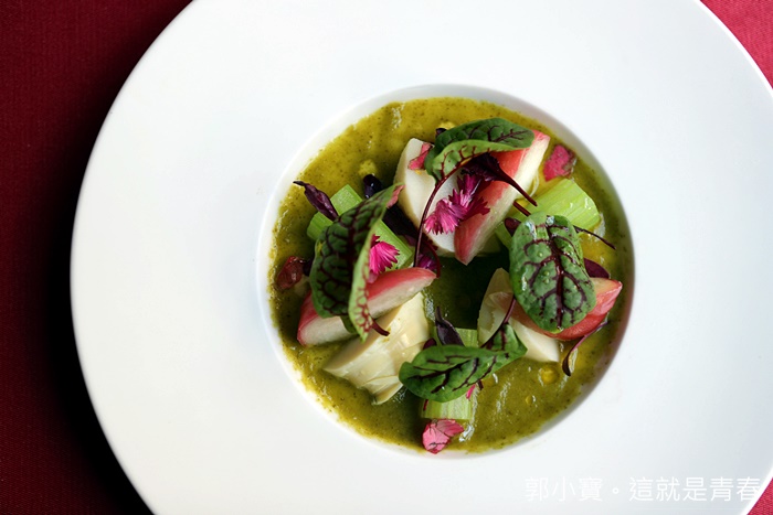 | 沙拉的部分也很美,這次每道菜的視覺上主廚都下了很足的功夫,蓮霧、冬筍、西芹這散樣我從沒想過可以搭配在一起,蓮霧的多汁加上冬筍的鮮甜還有西芹的青脆口感,搭配香芹醬汁一整個非常的爽口。 |