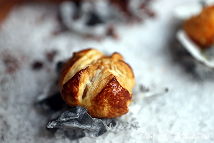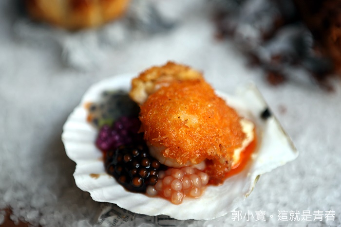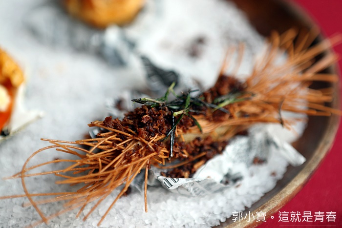 | 迷迭香可可酥炸淡菜如果不說的話,我可能真的要費很多勁才能猜得出他是淡菜,淡菜呈現這樣的方式真的非常耗時費工,吃起來口感還滿豐富的,外層炸得酥脆,咀嚼幾口後淡菜的水分跟鮮甜一整個就跑出來了。 |