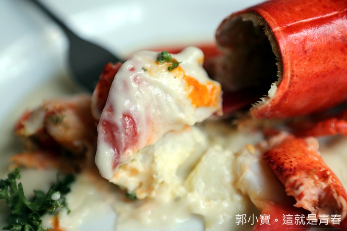 | 龍蝦肉的滋味就是無可比擬的好滋味阿,蝦肉的口感非常緊實彈牙,不是那種鬆散的口感,重點裡面竟然還有北寄貝,北寄貝的口感也是我超愛的,在貝類裡面北寄貝也算是高檔食材,口感更加彈牙,搭配小洋蔥絲絨醬汁真的超好吃! |
