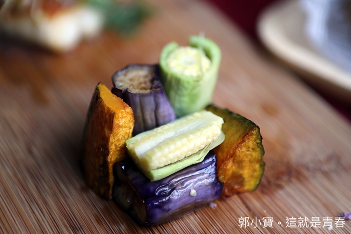 | 搭配的蔬食是玉米筍、茄子跟南瓜,主要色彩搭配的很豐富,看起來讓人食指大動。 |