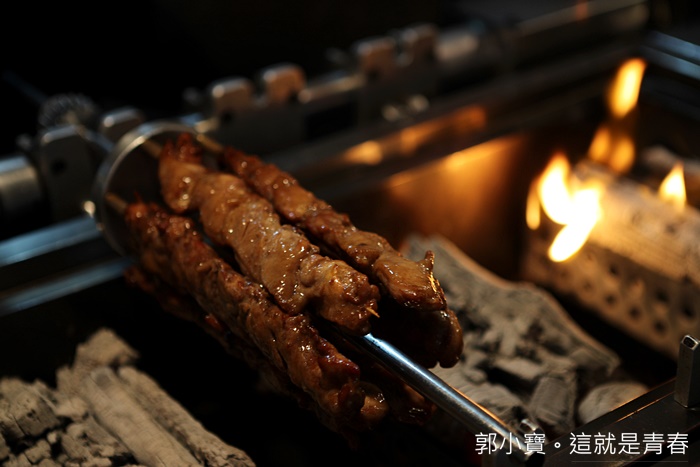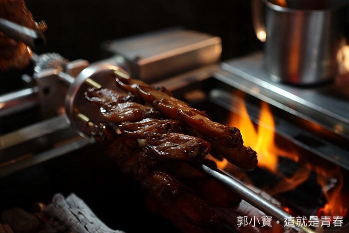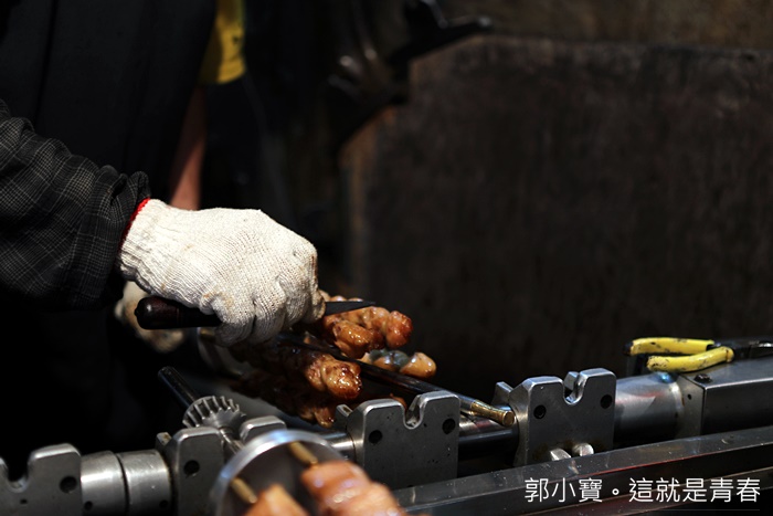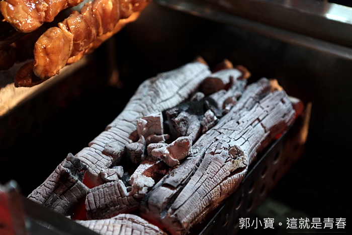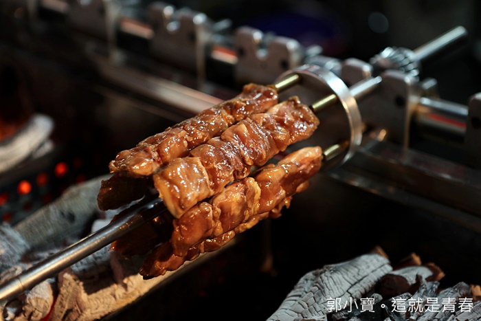 | 別以為老闆的滾輪只是自動翻轉讓他受熱均勻,仔細看就可以看到滾輪其實正下方都不是木炭,避免肉汁滴在木炭上造成煙霧瀰漫,利用兩邊木炭的熱對流急速加溫將食材瞬間加熱,基本上很少吃到焦皮的部分。 |