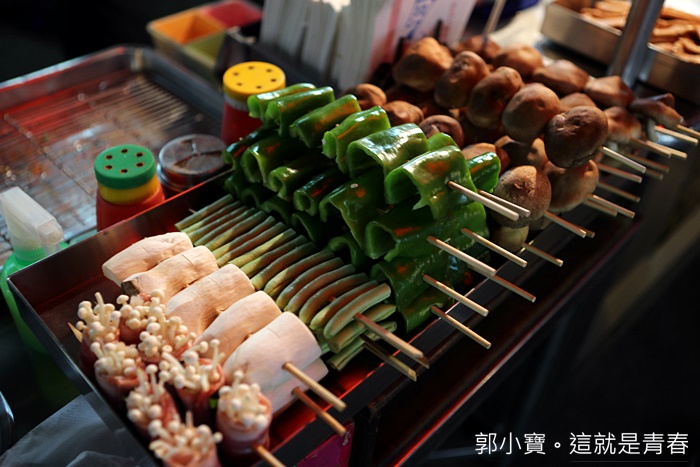 | 招牌商品都是放在攤子前方,旁邊還有一些青椒跟杏鮑菇等食材。 |