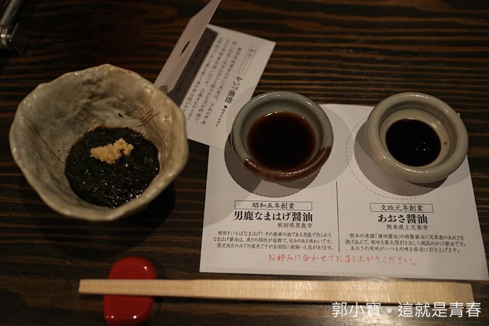 | 店家在每個人的桌上來特別擺了兩款醬油,一款是男鹿半島的在地醬油,一款是熊本縣的醬油老舖,這兩家的醬油味道都不一樣,一款偏重一款偏淡。 |