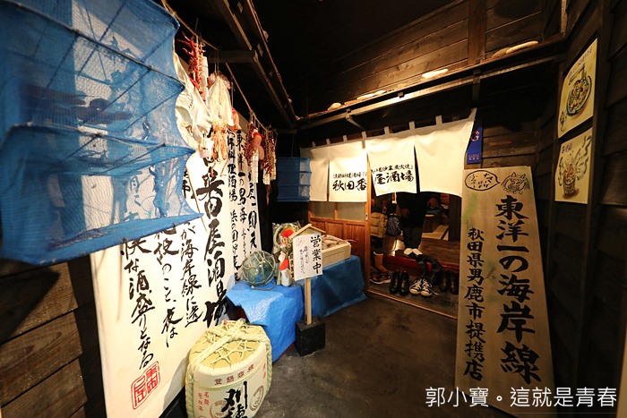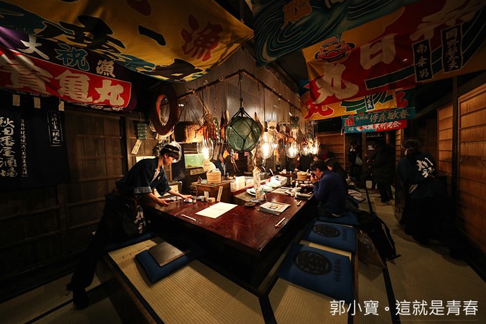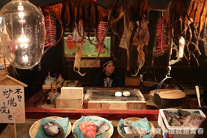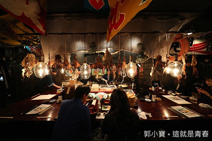 | 餐廳中間的板前區則是主打爐端燒,很多布置物都是主打魚貨新鮮的概念,有很多漁網、浮球等漁業用具當成裝飾物,店內的生意真的很好,這些照片都是我們吃到超晚店家都要關門前我才拍到的空景照。 |