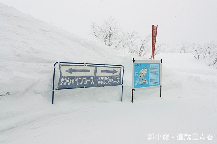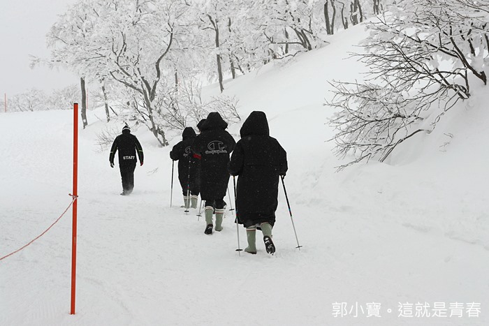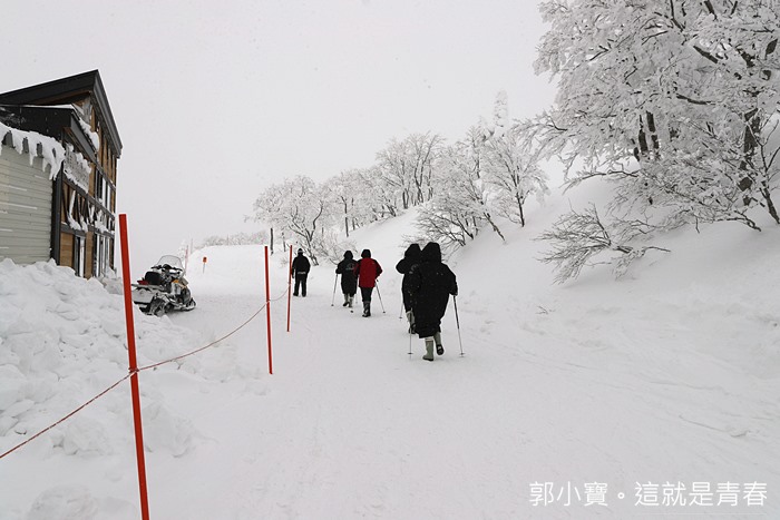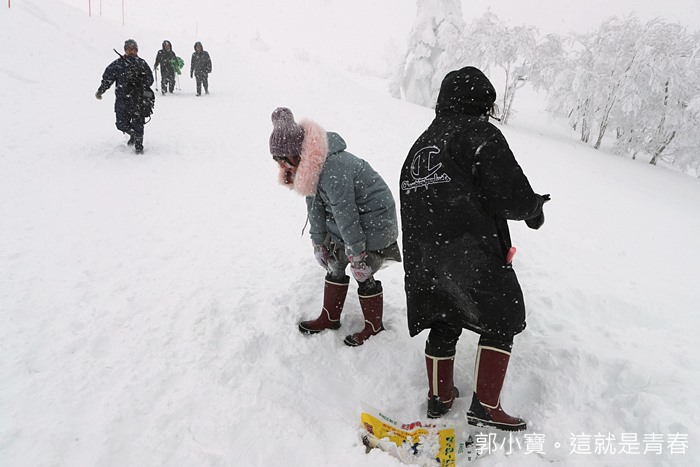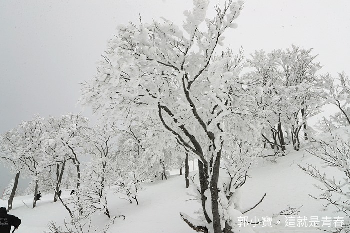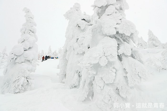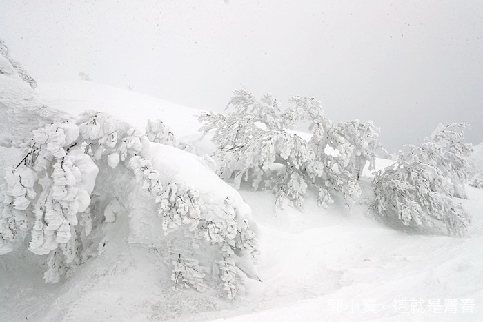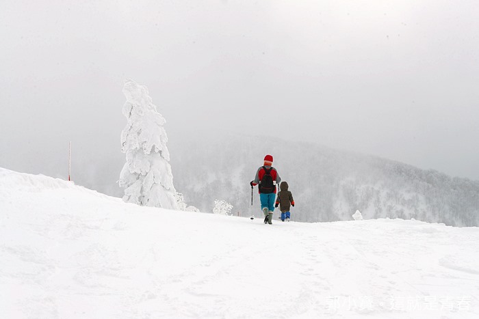 | 換好裝備後我們一行人就出發往樹冰的聚集地前進了,當天雖然沒有大晴天,但是能見度還算是清晰可見,這樣的天氣我就已經覺得很幸運的,森吉山的降雪量也很恐怖,建議要沿著紅線內的道路行走,不然一不小心你很可能就消失在雪中了。 |