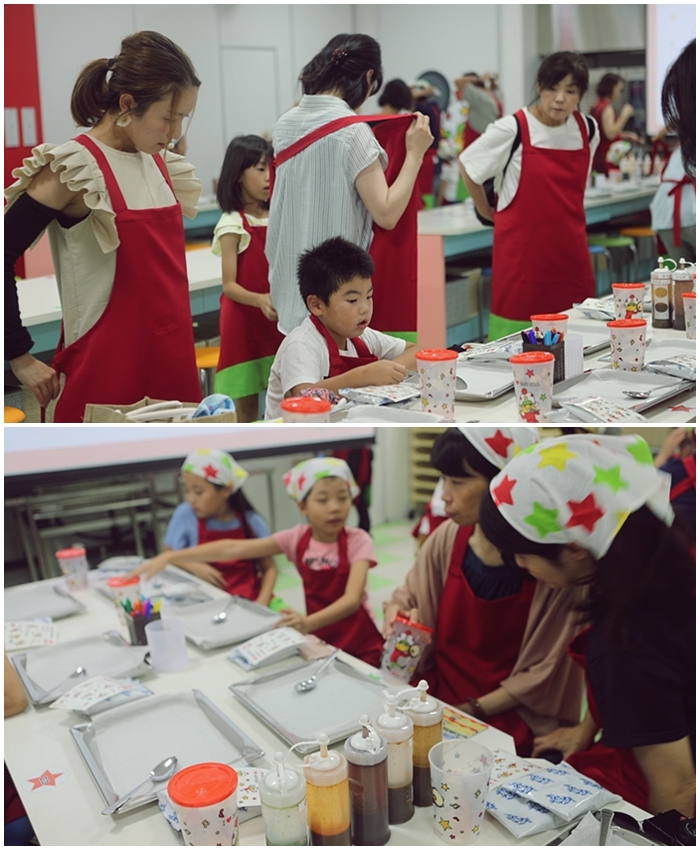 | 體驗DIY的部分幾乎都是家長陪同小孩一起進來的,日本有很多這類型的親子體驗廚房,小朋友綁上頭巾的模樣都好可愛,頭巾最後可以帶回家當紀念品,但是圍裙就要歸還了。 |