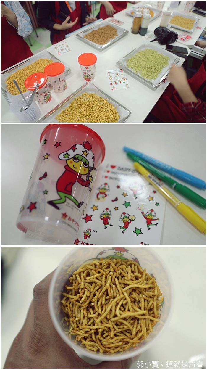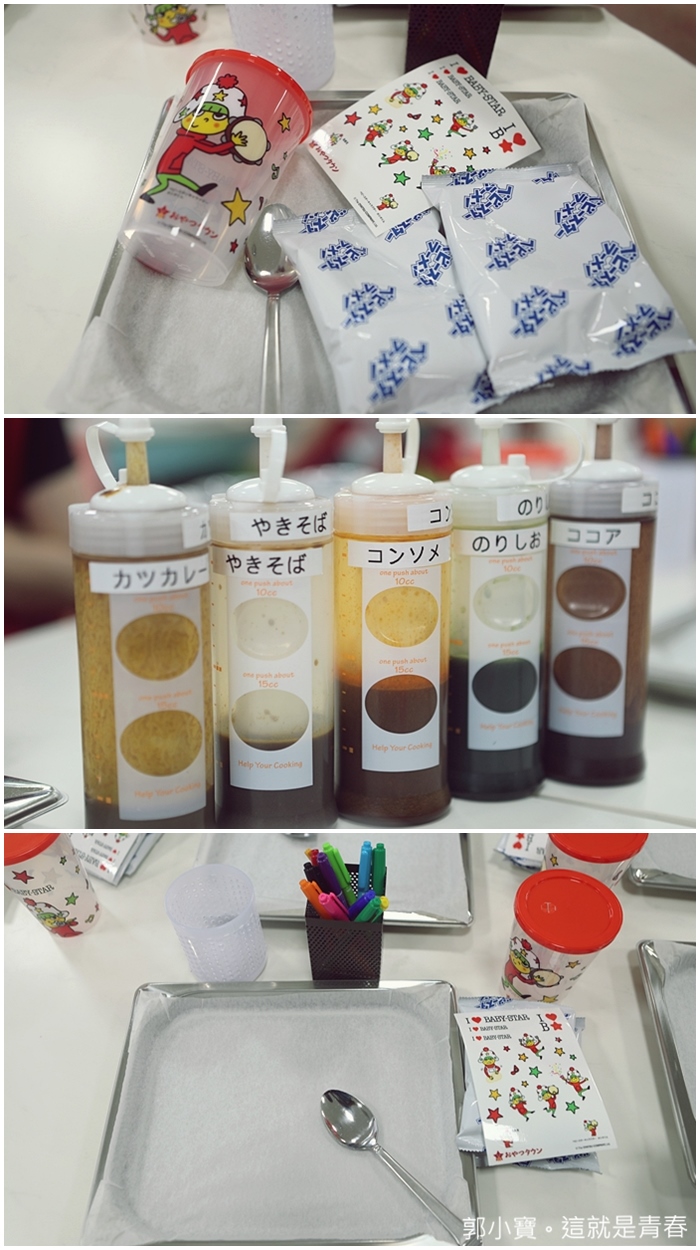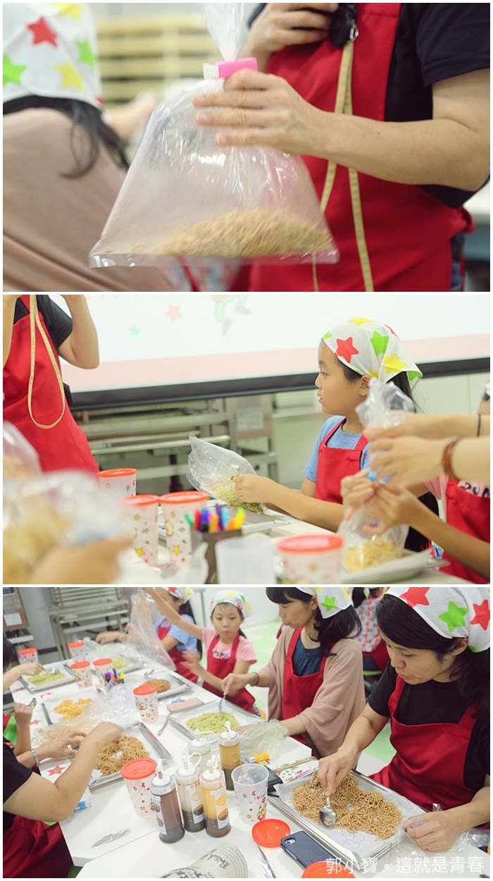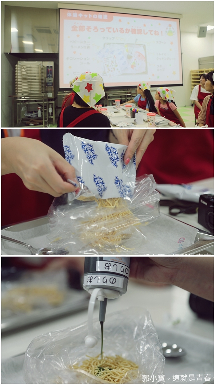 | 工作人員會一邊講解一邊帶領大家如何製作出好吃的點心麵,先將桌上幫大家準備好的點心麵拆開來倒進去塑膠袋內,然後選擇妳喜歡的口味倒入。 |