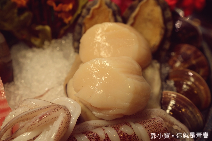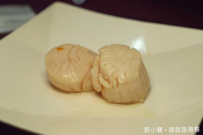 | 同樣也是生食級的大干貝,記得干貝也不要涮太久,不然會太老造成口感沒有那麼好,銅花的干貝除了碩大以外,彷彿都可以撕成干貝絲的視覺感很好,入口同樣十分滿意。 |