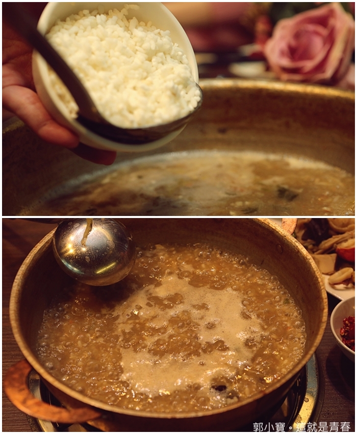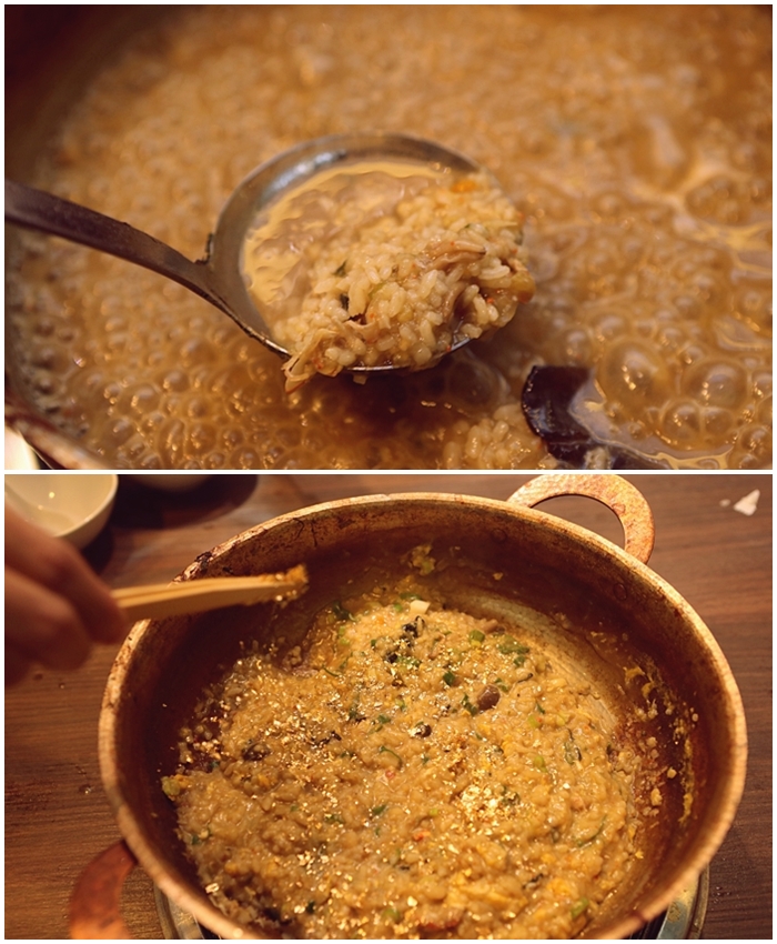 | 套餐最後的重點就是黃金稀飯了,服務人員會來幫鍋內的食材通通撈起,因為這一鍋高湯真的是超級精華,除了有牛肉以外還有超多生海鮮,所以拿來最雜炊真的非常適合。 |