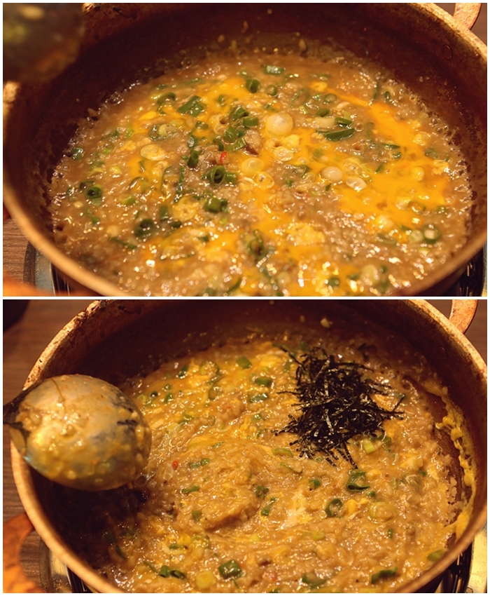 | 小火慢慢把高湯收乾,加上蛋黃跟紫菜絲、蔥花等,漸漸的香氣越來越濃郁,這一鍋雜炊真的用看的就知道超厲害!!! |