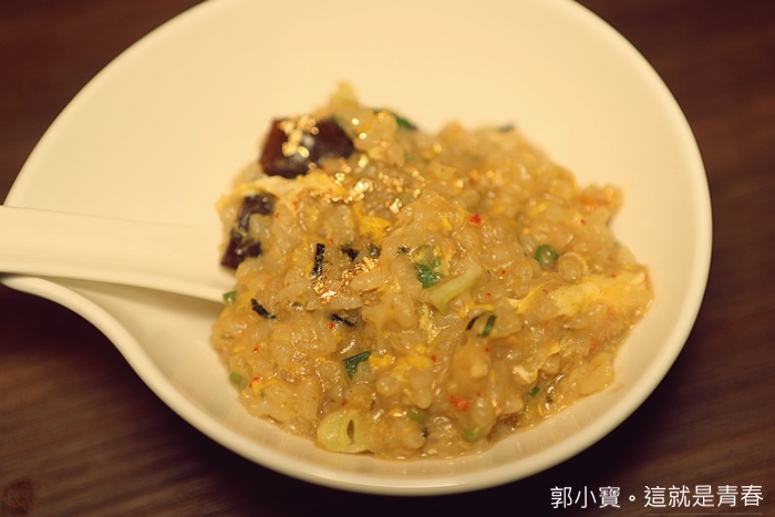 | 差不多熬煮後工作人員就開始撒上亮金金的東西,仔細一瞧才知道撒上超多金箔,這也太大氣了吧,一點都不手軟的狂撒,這雜炊也太奢華了,這黃金稀飯真的非常濃郁,每一口都是濃濃的海鮮味,我個人比較台式,如果可以再加上一點點胡椒的話那就無敵完美了XD |