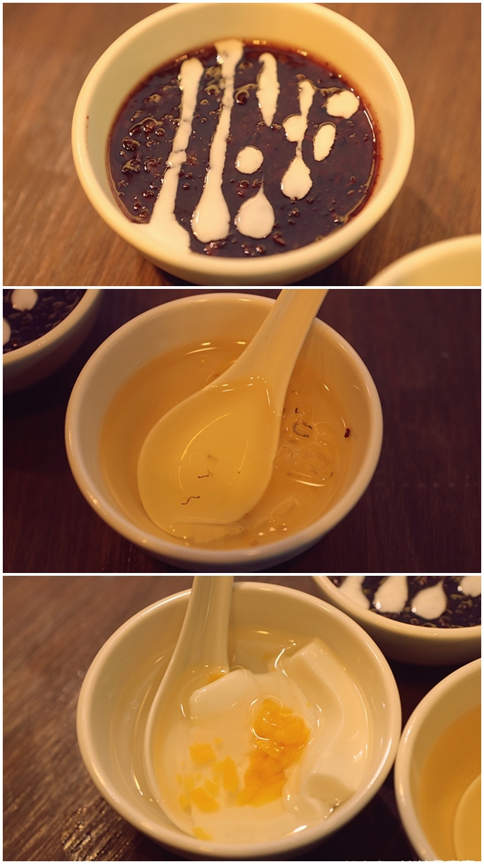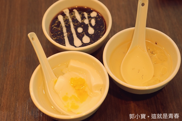 | 飯後甜點有三款,但是服務人員看到我們是一家三口,所以就一次把三種都上給我們品嘗了,銅花精緻涮涮鍋真的還滿大方地,看客人吃的開心就會開始招待,三款甜點都頗有水準,我家Cola對菜燕最捧場。 |