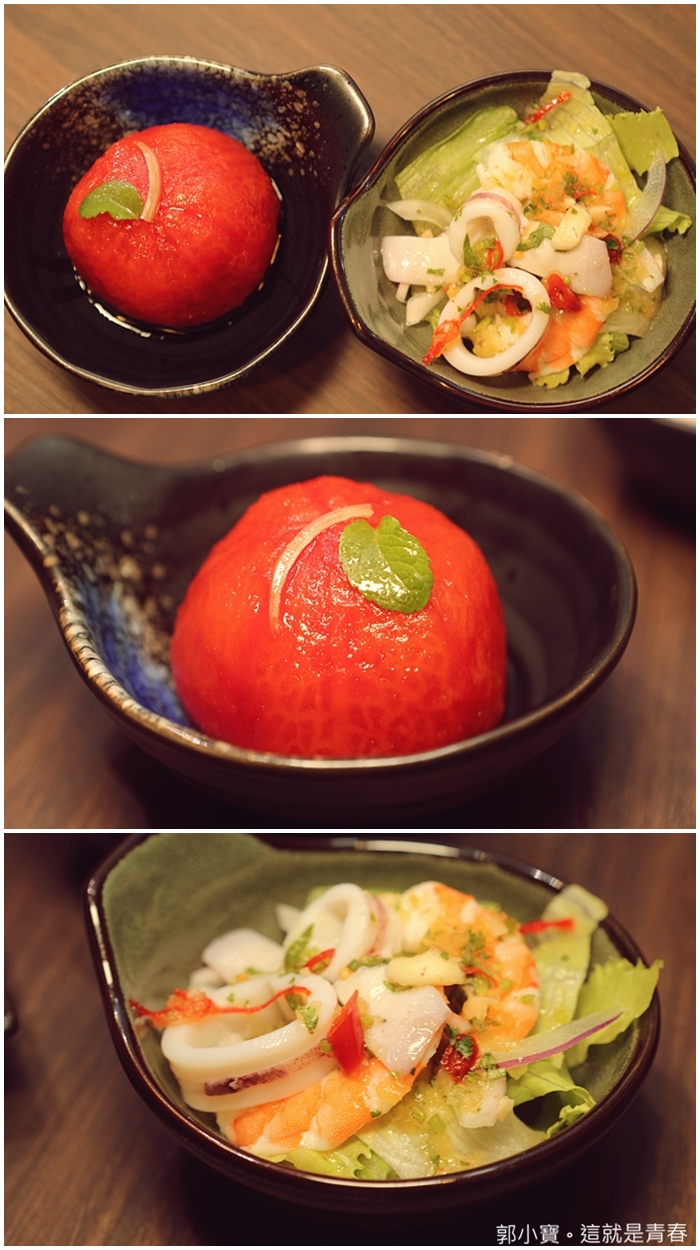 套餐全套的餐點非常齊全,前菜的部分有三款可以選擇兩款,我們選擇了泰式沙拉,吃起來非常開胃,大吟釀番茄有出乎我意料之外的特別,一整顆的番茄酸甜滋味很美味。 |
