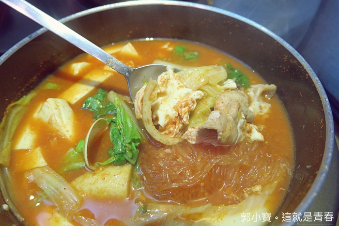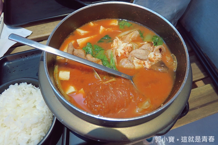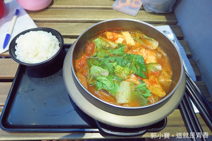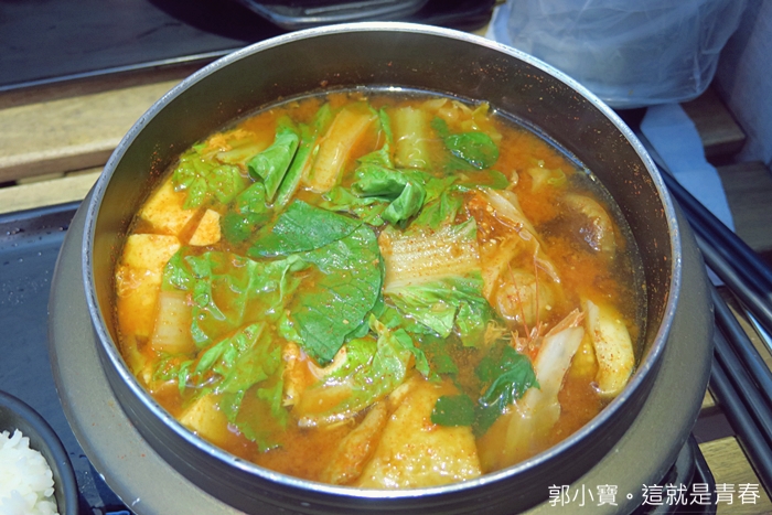 | 老婆點的韓國泡菜鍋,老實說這湯頭我沒有那麼喜歡,我還是比較推薦大醬湯,不過泡菜鍋的配料好像比較多一點。 |