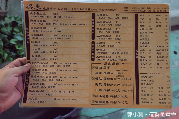 | 梁記的菜單看起來價格還都在可以接受的範圍,雖然說是小火鍋,但是有些品項價位比三媽高了一點,有一些則是在百元左右的小鍋物,原湯頭的部分則式都不用加價,但是其他湯頭可能就要另外加價,辣度調整也需要加價。 |