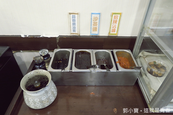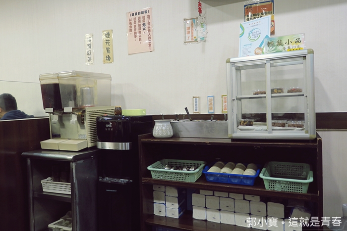 | 櫃檯旁邊是飲料跟醬料區,還有一個小菜的櫥櫃,小菜要另外付費,飲料是紅茶。 |
