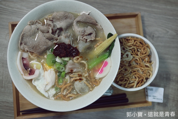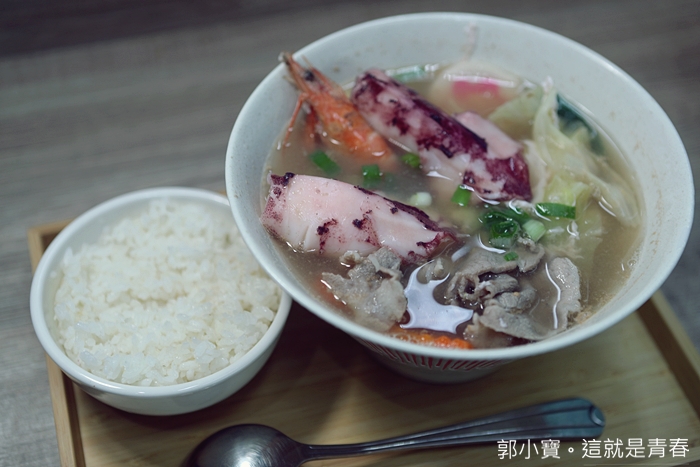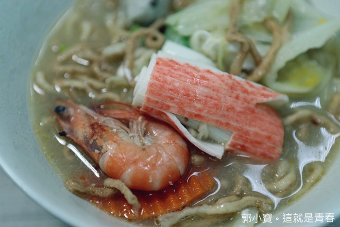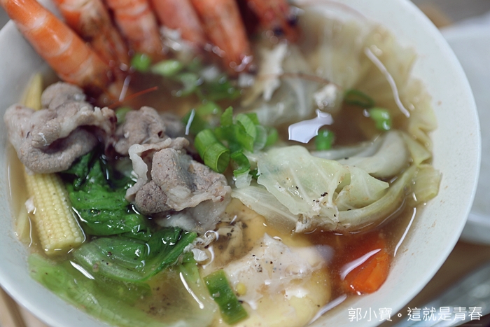 | 吃鍋燒麵當然要先試試看原味鍋燒,看起來配料還滿豐富的,除了有4.5片豬肉片以外還有一顆蛋、火鍋料3.4種加上蝦子、花枝等海鮮。 |