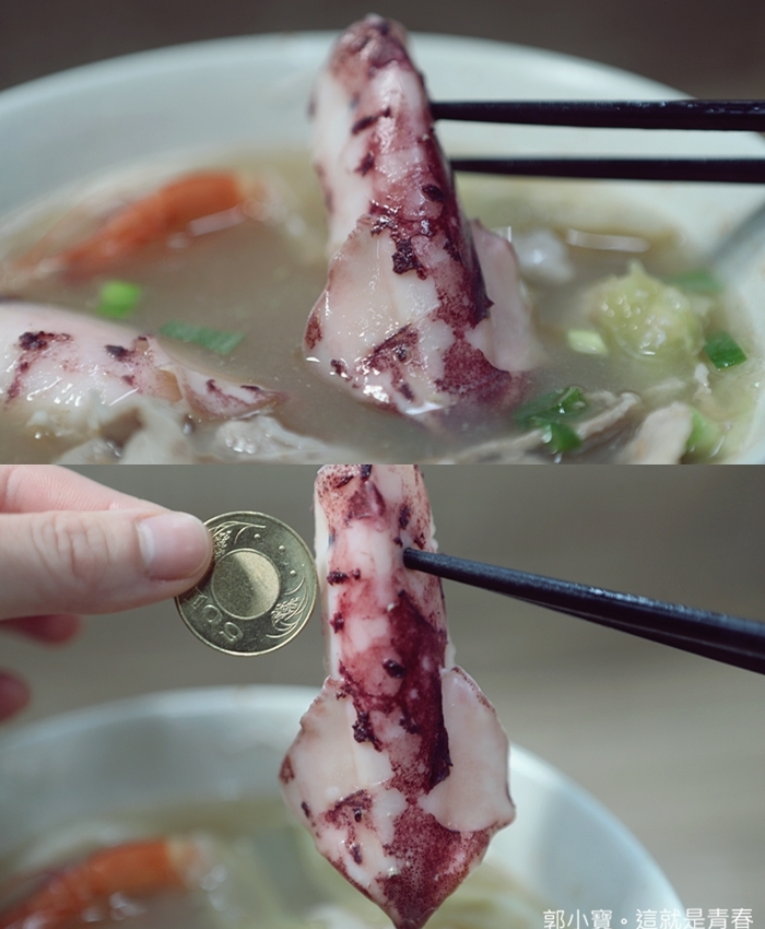 | 小卷的尺寸真的還滿大的,就連厚度都很厚實,一口咬下就可以享受她的新鮮彈牙的口感,絕非路邊平價的小卷,而且一次兩隻吃得相當過癮,另外就是她的湯頭加上了薑汁,搭配小卷喝起來真的超鮮甜的,帶點薑汁讓湯頭整體的層次更加的豐富,我也超推薦這一碗的。 |