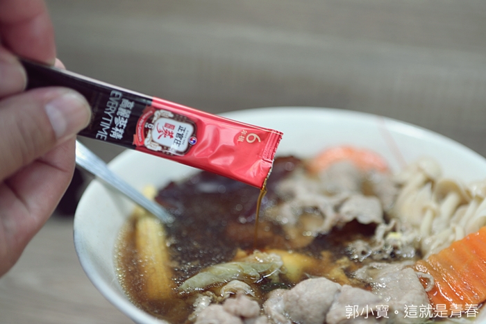 | 養篸的湯頭本身就用很多中藥熬煮出來,你可以加購30元還有一包正官庄的高麗篸精。 |