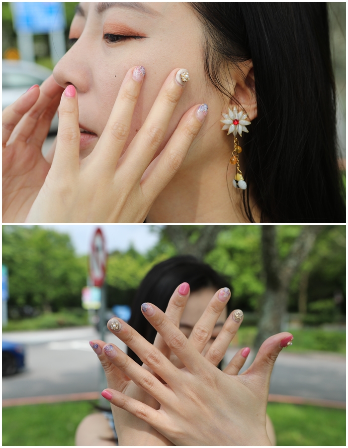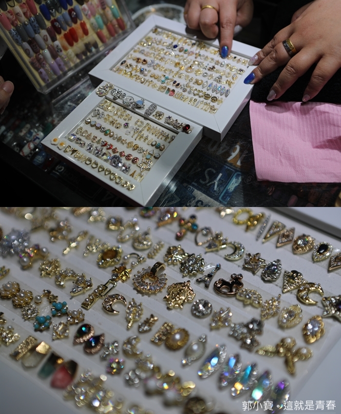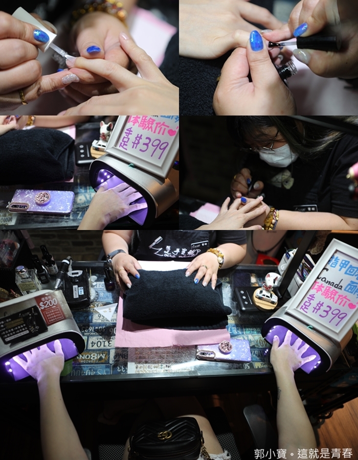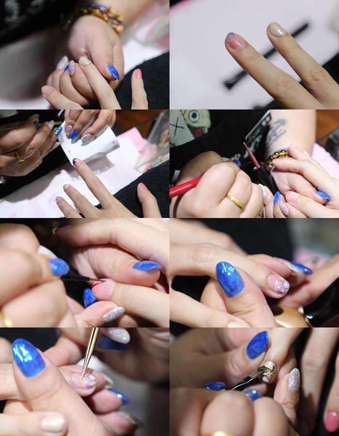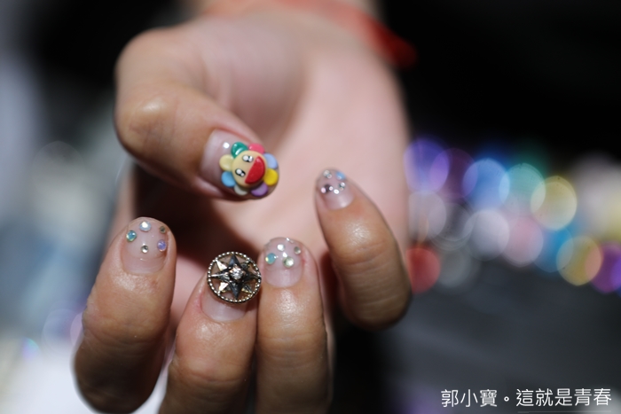 然後上光療膠再硬化,彩繪、貼飾品這樣反覆的過程真的很傷眼,尤其要在這小小的指甲片裡面做出那麼多的創意真的需要很深的功力,拍到我自己都不好意思是不是妨礙店長工作了XD