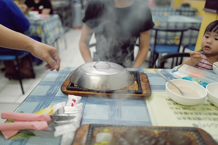 | 上上牛排使用的是鐵板,所以有帶小朋友的話大家要小心避免燙傷,是很傳統的鐵板牛排,一端上來還沒打開鐵蓋就可以聞到香氣四溢。 |