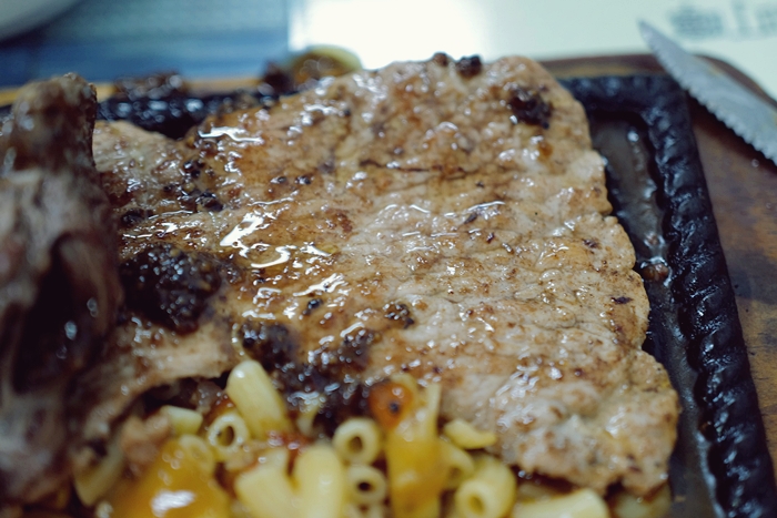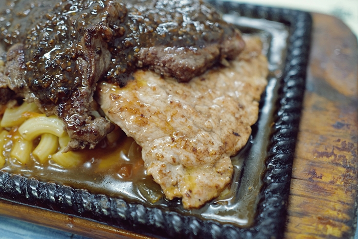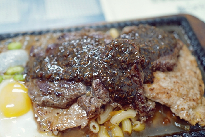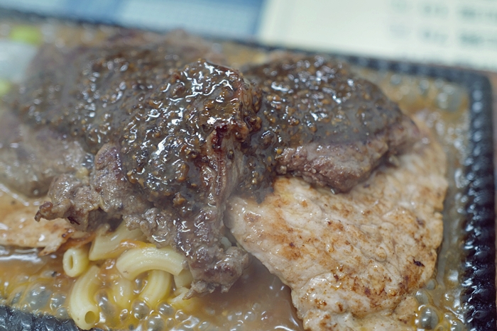 | 上上牛排的黑胡椒醬確實有點南部的味道,雖然有黑胡椒的辛辣香氣,但是入口有點甜味,牛排跟豬排兩大塊堆疊在一起。 |