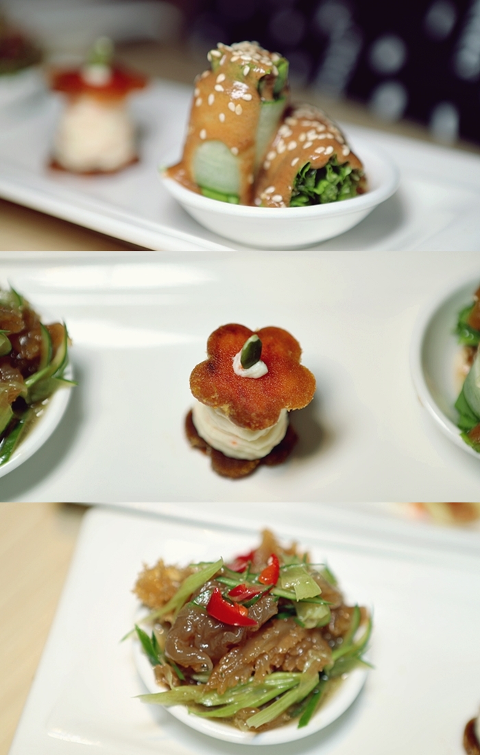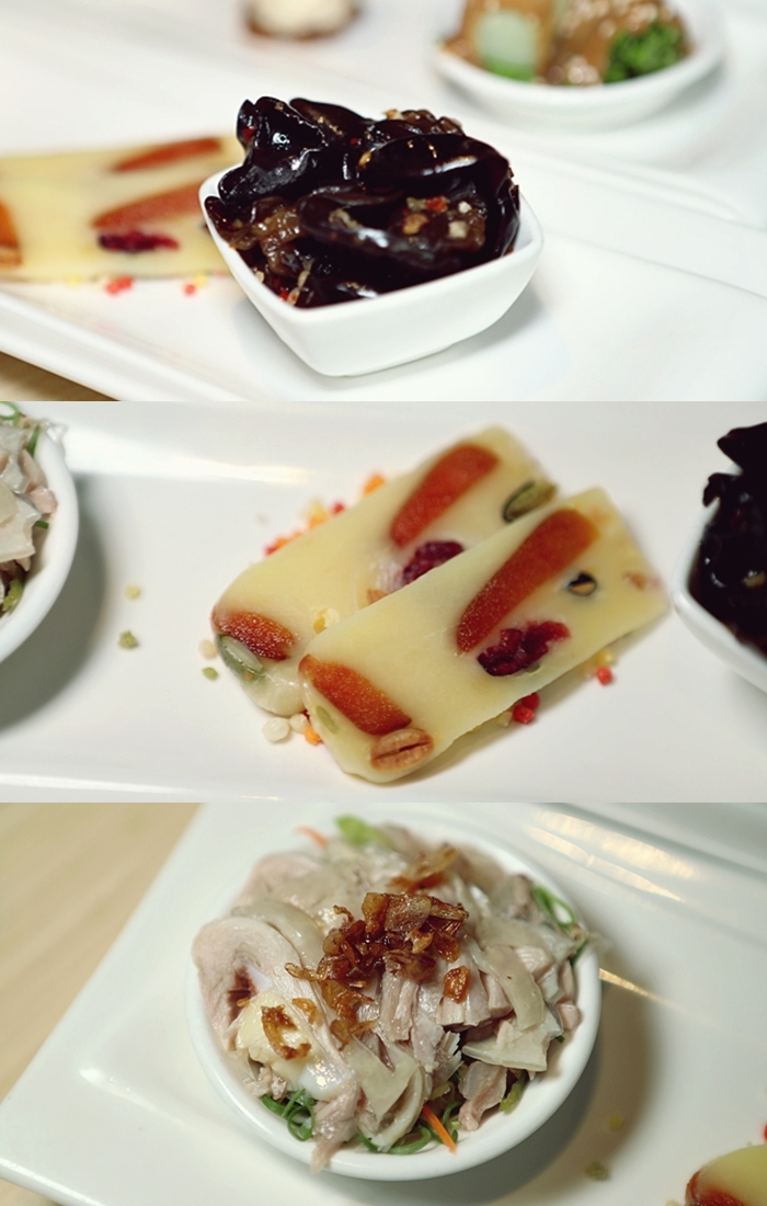 | 鯉魚的套餐都會有三樣小菜,有兩款組合涼菜可以選擇,並會以不同季節食材來做變化。 |