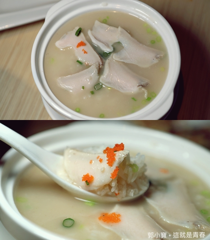 | 近期在鯉魚餐廳內頗受歡迎的鮑魚粥,人氣直追烏魚子炒飯,切片鮑魚另外裝盤沒有跟粥放在一起,方便客人自己決定要單吃還是放到粥裡一起食用,上面還撒了大量的蝦卵,視覺趕上也很豐富。 |