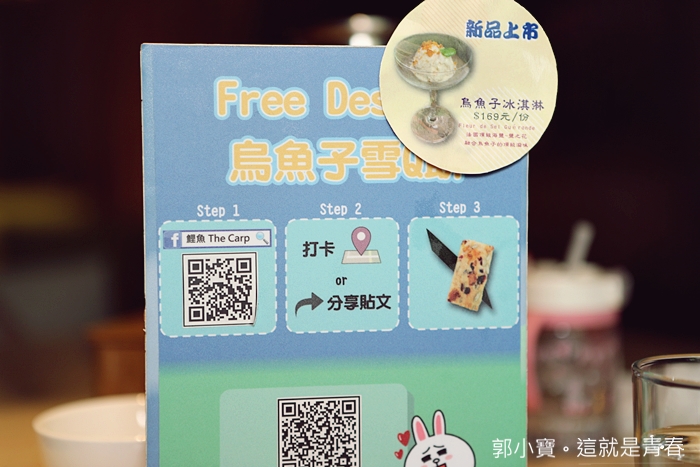 | 鯉魚餐廳的打卡活動是烏魚子雪Q餅,一看到這個立馬轉頭拿手機來打卡,這邊的甜點真的讓我們覺得很特別又喜歡。 |