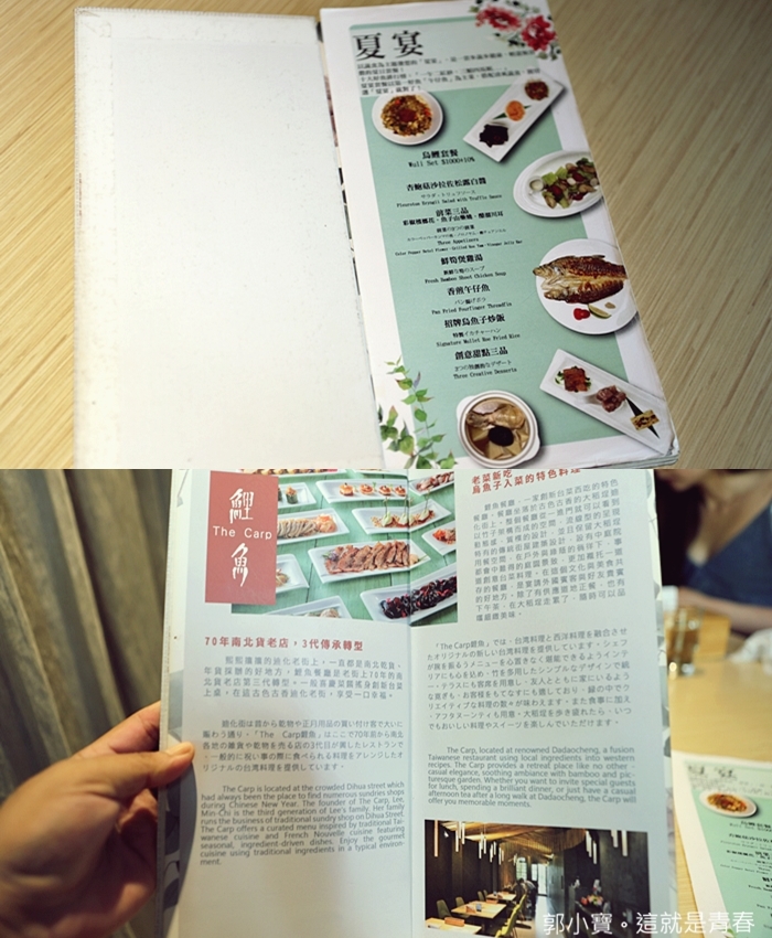 | 菜單裡面就有敘述鯉魚的南北貨老店及餐廳的歷史沿革,看了一下菜單的價位,其實並沒有特別貴,都在合理能接受的範圍內。 |