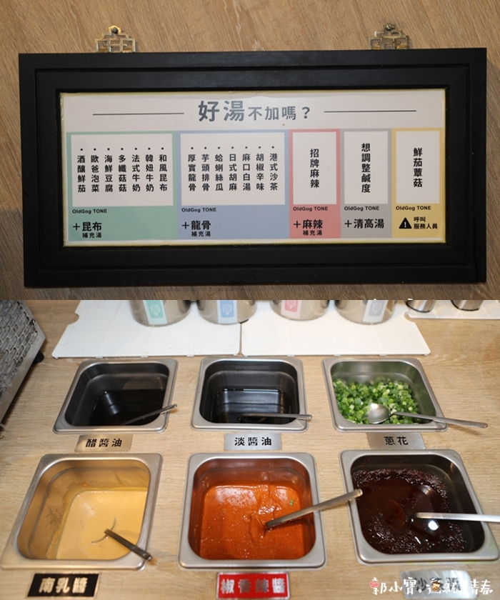 | 餐檯還有要添加的高湯壺,牆上還有用明顯的顏色區分美一種湯頭分別要添加的高湯壺是哪一壺,這個還滿貼心的,醬料的部分也擦拭得很乾淨,即使是生意滿滿也都會有人員固定來清理擦拭,醬料則是總共有六種選擇。 |