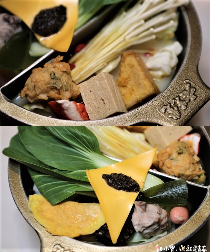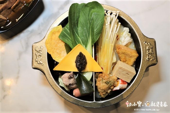 | 個人用的鴛鴦鍋應該算是老先覺全台首創了,以前最吸引我的就是老先覺的個人鴛鴦鍋,雙重湯頭雙重享受阿,不用再約其他人一起吃鴛鴦鍋,這次直接就黑金鴛鴦鍋開鍋,火鍋料還滿多的,像我個人就是很重視火鍋料的人,松露醬直接放在起司片上超誘人的。 |