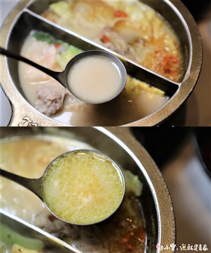松露湯頭喝起來十分滿足,濃郁的松露香氣在鼻裡還有嘴裡都非常飽滿,曜金薑黃鍋則是搭配了百年的老店黑白麻油,薑黃跟麻油都是秋冬的滋補養身聖品,喝一口湯頗讓我意外,滋味非常溫潤,相比起來薑黃鍋的滋味層次較為豐富,這個兩湯頭一個單純一個複雜,難怪會被老先覺當成秋冬限定。