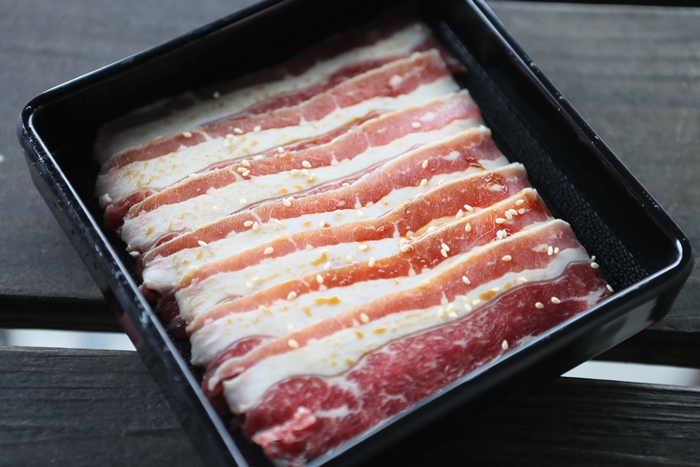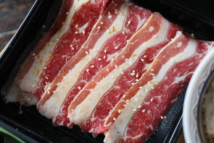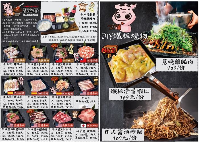 豚兵衛個人燒肉定食菜單非常豐富,每一款燒肉定食套餐價位都含兩盤肉品,牛五花是基本搭配的肉盤,可以直接選擇另一種肉即可,另外單點一盤牛五花也只要49元超划算,不吃牛的朋友也可以選擇換成豬肉或是雞肉,豬肉的部分都有標示原產地,看起來是沒有任何美豬的。