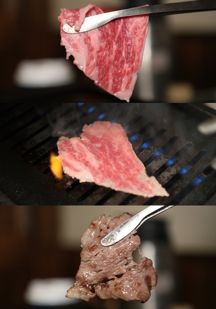 | 和牛油脂非常多,所以烤一下就真的要快拿起來了,看起來真的口水都快流下來了,加上橫膈膜這樣還有附餐、白飯等等的才賣799元真心覺得不貴。 |
