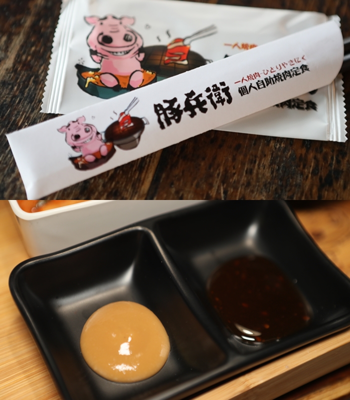 | 詢問店員豚兵衛個人燒肉是林北烤好的延伸嗎? 她們說不是豚兵衛就是豚兵衛,是不一樣的體系,所以就連濕紙巾跟筷套都有自己的專屬的,調味料很不錯吃,我滿喜歡味噌醬的。 |